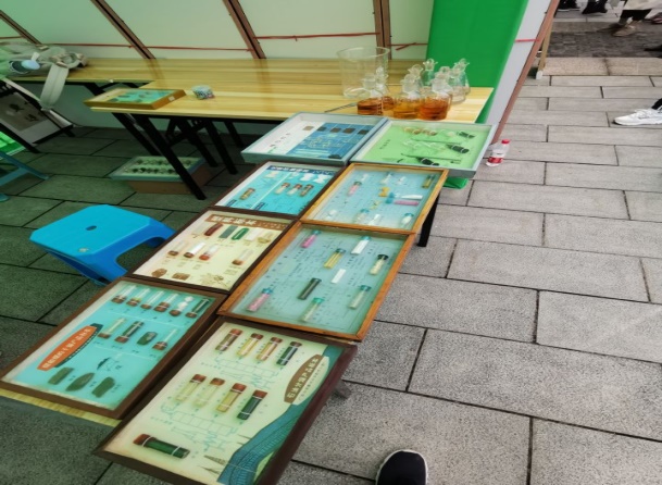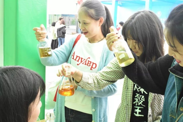 环化学院参展主要分为三部分:化学物质标本展览、化学仪器展览和趣味化学实验展览。标本展览集中展示了生活中所用、所见和所接触物品的化学物质组成和主要的生成反应。化学仪器展览展示了科技发展导致的实验室精密化学仪器的变革过程。尤其吸引大家的是趣味化学实验展览,摇一摇就会变色、宛如“红绿灯”的实验吸引了一拨又一拨的同学。在听过实验员耐心细致的讲解后,同学们纷纷上前亲自动手尝试,在惊叹神奇实验现象的同时,不时地询问其中的化学原理。