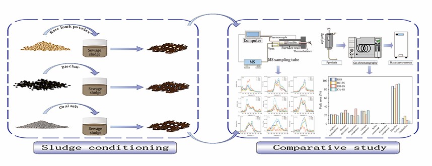 城市剩余污泥是城市污水处理过程中的副产物。据统计,2020年中国的污泥年产量达到6000-9000万吨。污泥中含有重金属、病原体、有机污染物、二恶英等多种有害物质,若处理不当,很容易造成二次污染。骨架调理污泥脱水是污泥处理的主要方法,但骨架调理剂对污泥调理-脱水-热解过程中热解产物的影响及机制尚不清楚。本研究通过热重质谱联用技术(TG-MS)和热解-气相色谱/质谱技术(Py-GC/MS),详细对比研究了生物炭、稻壳、粉煤灰三种骨架颗粒调理后的污泥热解过程中可凝气体/不可凝气体的释放特性,以阐明不同骨架调理剂对污泥热解产物的影响。通过全面对比和分析骨架调理剂在污泥热解中的反应机制以及对热解产物的影响,为今后研究骨架调理剂提高污泥脱水和热解工艺提供理论依据。