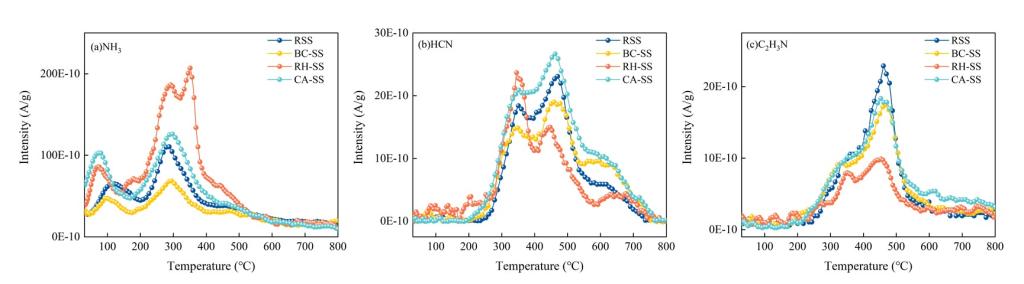 研究发现,稻壳的添加增加了NH3的释放,由于稻壳中氮元素主要存在易挥发的DNA、RNA和生物碱中,而原污泥中大部分氮元素存在于无机或热稳定有机质中。HCN的释放过程主要出现在300-550℃,其主要来源是加热条件下不稳定的吡咯氮键,除此之外,部分吡啶氮也是HCN的来源。此外,在600-700℃还观察到一个释放尖峰,这源于污泥中矿物质的催化作用,促进了含氮结构的分解,导致了HCN的生成。C2H3N的释放峰分布形状与HCN相似,它们可能存在相类似的形成途径,此外,-CN官能团有类似卤素的性质,可能还存在与烃基的结合和烷烃的取代反应。