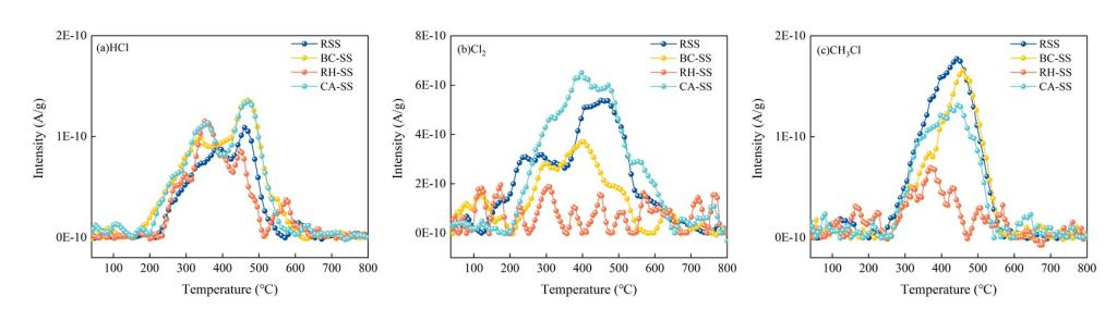 研究表明,HCl的来源可能是污泥中一些氯化物在热解过程中生成HCl,污泥中无机氯化物与SiO2反应也会生成HCl和Cl2。