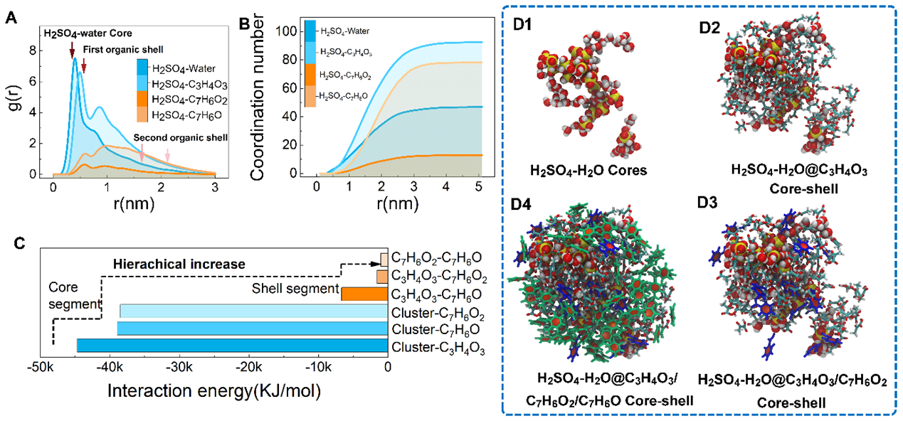 图1A为径向分布函数计算结果,观察到两个明显的特征峰,结果快照直观地观察到典型的核-壳结构,其中,水-硫酸团簇为核,丙酮酸为第一有机层壳,苯甲酸和苯甲醛为第二有机层壳。此外,分子间能量结果也表明了观测到的分子等级协同效应。