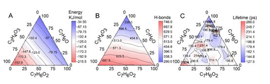 此外,为了探究甲苯光氧化产物之间的比例关系对纳米粒子成核的影响,构建了三维相图。结果表明系统总能量、氢键数量高度依赖于丙酮酸的分子比,证明了丙酮酸是桥联水-硫酸团簇与苯甲酸和苯甲醛形成纳米粒子的关键组分。