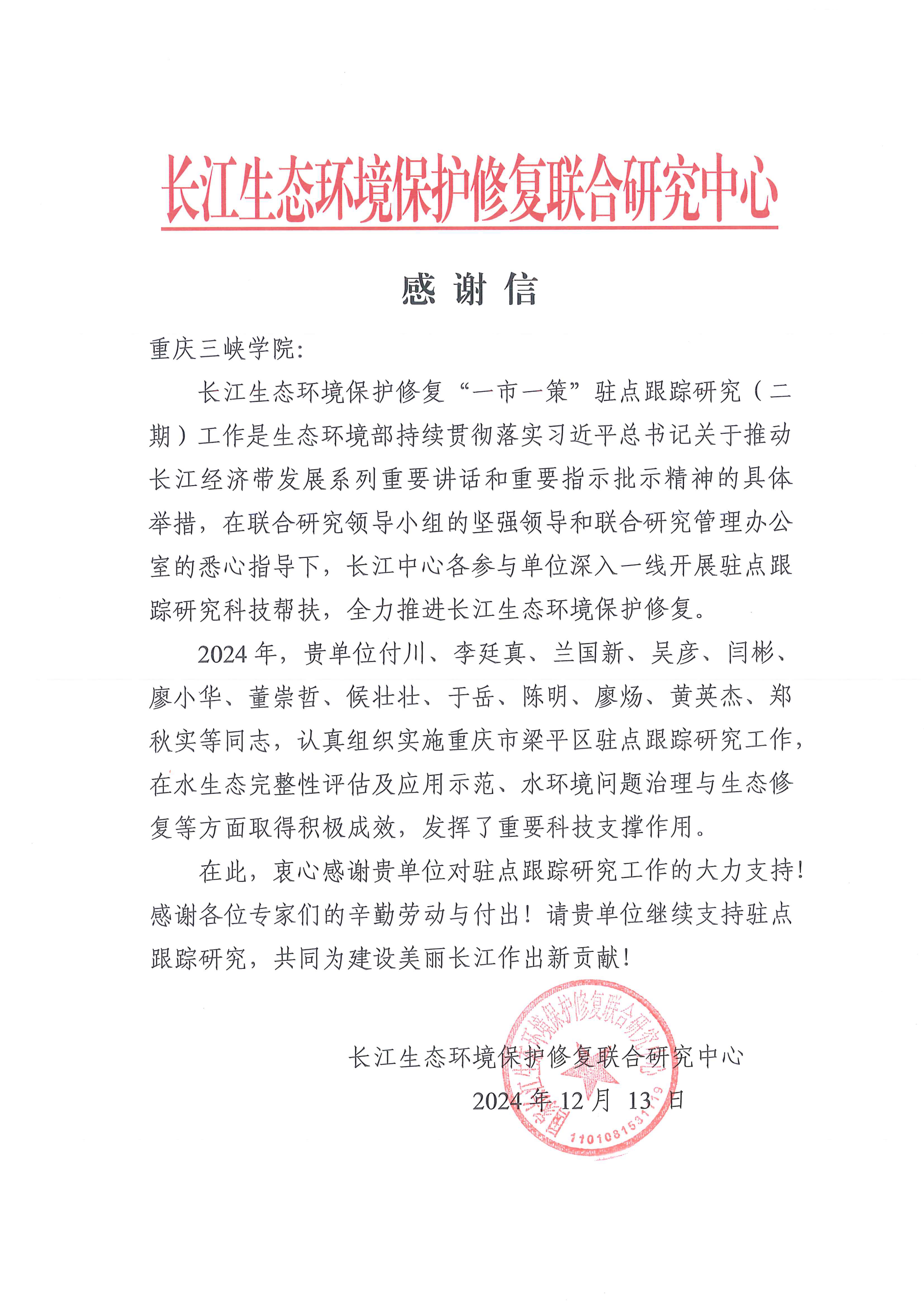 近日,长江生态环境保护修复联合研究中心发来感谢信,致谢付川教授团队师生在重庆市梁平区开展长江生态环境保护修复“一市一策”驻点跟踪研究(二期)工作中,为当地实施水污染治理与生态修复精准施策,提供了重要科技支撑作用。