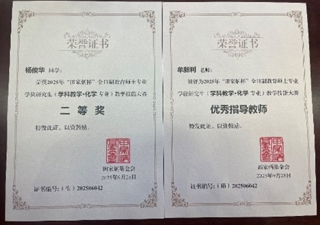 在9月28日落幕的2025年全国“田家炳杯”全日制教育硕士专业学位研究生学科教学(化学)专业教学技能大赛决赛上,学院2023级学科教学(化学)专业研究生杨俊华以过硬的教学本领和良好的现场发挥,最终取得全国二等奖的优异成绩。这是学院学科教学(化学)专业研究生自参与该赛事以来取得的最高荣誉。