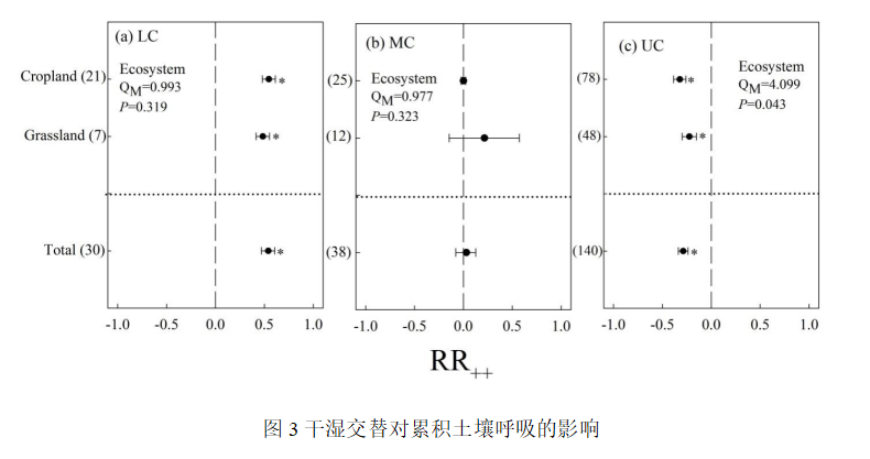 总体而言,本研究通过meta分析,在全球尺度上对干湿交替影响累积土壤呼吸做了全面评估,揭示了环境、土壤和实验变量调节累积土壤呼吸响应干湿交替的一般模式;表明土壤物理结构的破坏及不同组分碳库对干湿交替的响应程度不同是导致累积土壤呼吸随干湿交替次数增加而持续增加的可能原因。本研究为理解气候变化导致的更频繁的干旱和强降水交替条件下土壤碳动态提供了基础数据,并呼吁以后的研究应考虑野外原位的长期观测实验,以及不同组分的土壤碳库对干湿交替的相对响应。