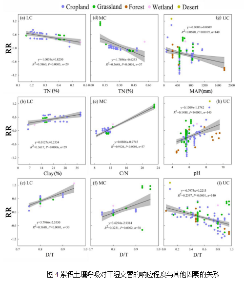 除此之外,研究还发现,与LC相比,TN与累积土壤呼吸呈显著负相关,黏粒含量及D/T(一个干湿交替周期内干旱天数与总天数的比)与累积土壤呼吸呈显著正相关(图4a-c)。与MC相比,TN与累积土壤呼吸呈显著负相关,C/N及D/T与累积土壤呼吸呈显著正相关(图4d-f)。与UC相比,pH与累积土壤呼吸呈显著正相关,MAP(年均降雨量)及D/T与累积土壤呼吸呈显著负相关(图4g-i)。表明土壤理化性质和实验处理均是控制干湿交替影响土壤呼吸程度的重要因素。