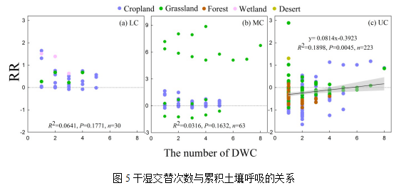 此外,本研究提取了每个干湿交替周期内的累积土壤呼吸数据,探索累积土壤呼吸与干湿交替次数的关系。结果表明,与UC相比,干湿交替次数与累积土壤呼吸呈显著正相关(图5c)。表明在多次干湿交替后仍然有持续性碳源被释放出来。而微生物可通过自我调节来适应干湿交替过程,因此,累积土壤呼吸随着干湿交替次数的持续增加可能是团聚体的持续破坏从而释放出物理保护的有机碳导致,也有可能是稳定性土壤碳库对干湿交替的响应更敏感导致的。而在与LC及MC相比时两者之间无显著性关系(图5a,b),由于样本量较小的问题(LC:n=30,MC:n=63),该结果还存在不确定性。