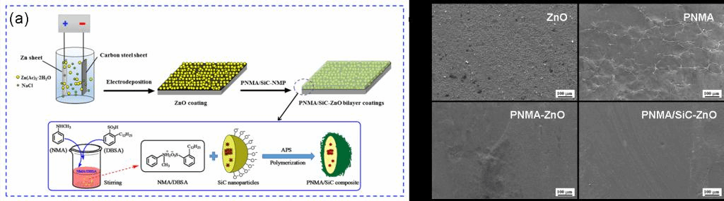 针对上述问题,必赢线路检测3003no1青年教师胡传波博士采用阴极电沉积法在碳钢基体制备强附着性ZnO薄膜,然后将化学氧化聚合法制备的易加工性聚N-甲基苯胺(PNMA)和PNMA/SiC复合材料通过共溶法沉积在ZnO表面,分别得到具有p-n结的强附着性PNMA-ZnO和PNMA/SiC-ZnO涂层。研究结果表明,相比于PNMA涂层表面大小不一的裂纹和成膜的不均匀性,PNMA-ZnO和PNMA/SiC-ZnO涂层具有良好的成膜能力,且PNMA/SiC-ZnO涂层对碳钢基体的腐蚀保护效率高达97.43%。