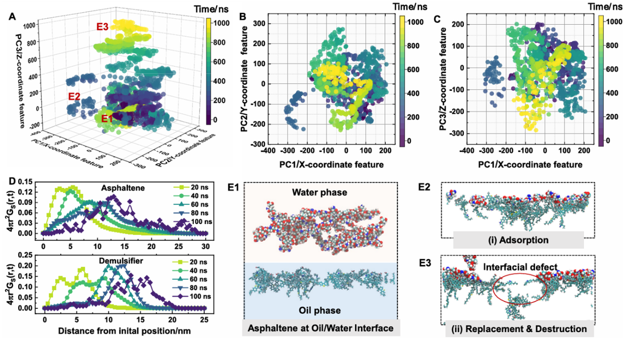图4基于无监督学习的主成分分析(PCA)展示了破乳剂在油/水界面处对沥青质的顶替过程:(A)三维PCA图,(B-C) PCA的二维投影(PC1-PC2和PC1-PC3),(D)van Hove相关函数,(E)典型模拟快照。