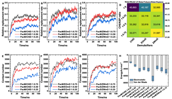 图3A-C说明了在不同破乳剂/沥青质比例(1:0.25、1:0.5和1:0.75)下,不同类型的破乳剂(CHID、EOmD和ZWmD)在油/水界面处群岛沥青质(PacM)随时间的变化相对顶替率。同样,结果表明,破乳剂的添加显着增强了界面对沥青质的替代。较高的破乳剂浓度对应于更高的顶替率,这突出了破乳剂/沥青质比例在优化界面动力学中的重要性。在测试的系统中,1:0.75的比率始终达到最高的顶替率,表明在较高浓度下具有饱和比效应。在图D中观察到,随着破乳剂浓度的增加,IFT明显降低,表明它们能有效地破坏含沥青质的界面的稳定性。图E-G则是沥青质和不同破乳剂之间的随时间变换的接触数。图H是沥青质和破乳剂之间的相互作用能。
