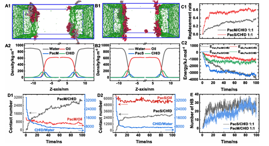 图2展示了壳聚糖破乳剂在油/水界面的顶替行为。图A1和图B1描绘了壳聚糖在水中通过自聚集运动,并在油/水界面富集,与沥青质发生界面顶替,使沥青质迁移至油相。图A2和图B2为MD模拟中各组分的密度分布图,可以观察到壳聚糖与沥青质在油/水界面的聚集现象,与图A1和图B1相互对应。图C1量化了壳聚糖对沥青质的界面顶替率,结果表明,在两种类型的沥青质中,PacS的顶替效果更佳。图C2则展示了体系内壳聚糖与沥青质之间的相互作用能,包括范德华作用和静电相互作用。结果表明,范德华力在相互作用中占主导地位,且PacS与CHID之间的作用更为剧烈,这一趋势与图C1中PacS的更高顶替效率相一致。图D1和图D2反映了MD模拟过程中不同组分的接触数随时间的变化。随着模拟时间的推移,壳聚糖与水的接触数逐渐减少,而壳聚糖与沥青质的接触数逐渐增加,最终在油/水界面形成稳定的界面顶替。图E则展示了壳聚糖与沥青质之间的氢键数量,为进一步理解两者的相互作用提供了重要信息。