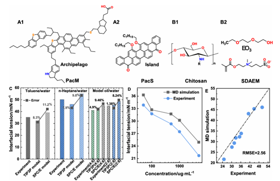 图1中A1和A2是本文中沥青质的结构式,图B1是壳聚糖的结构图,图B2是环氧乙烷和两性离子的结构图,对于壳聚糖进行改性;图C是在实验条件下的IFT和不同水模型下MD模拟的IFT值,可以看出TIP3P水模型与实验值更加接近;图D是在TIP3P水模型下的不同浓度沥青质与实验值值相对比,呈现相同的趋势;图E是IFT值的均等性对比图(y=x),用于比较实验与基于TIP3P模型的MD模拟结果。