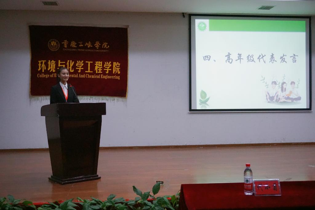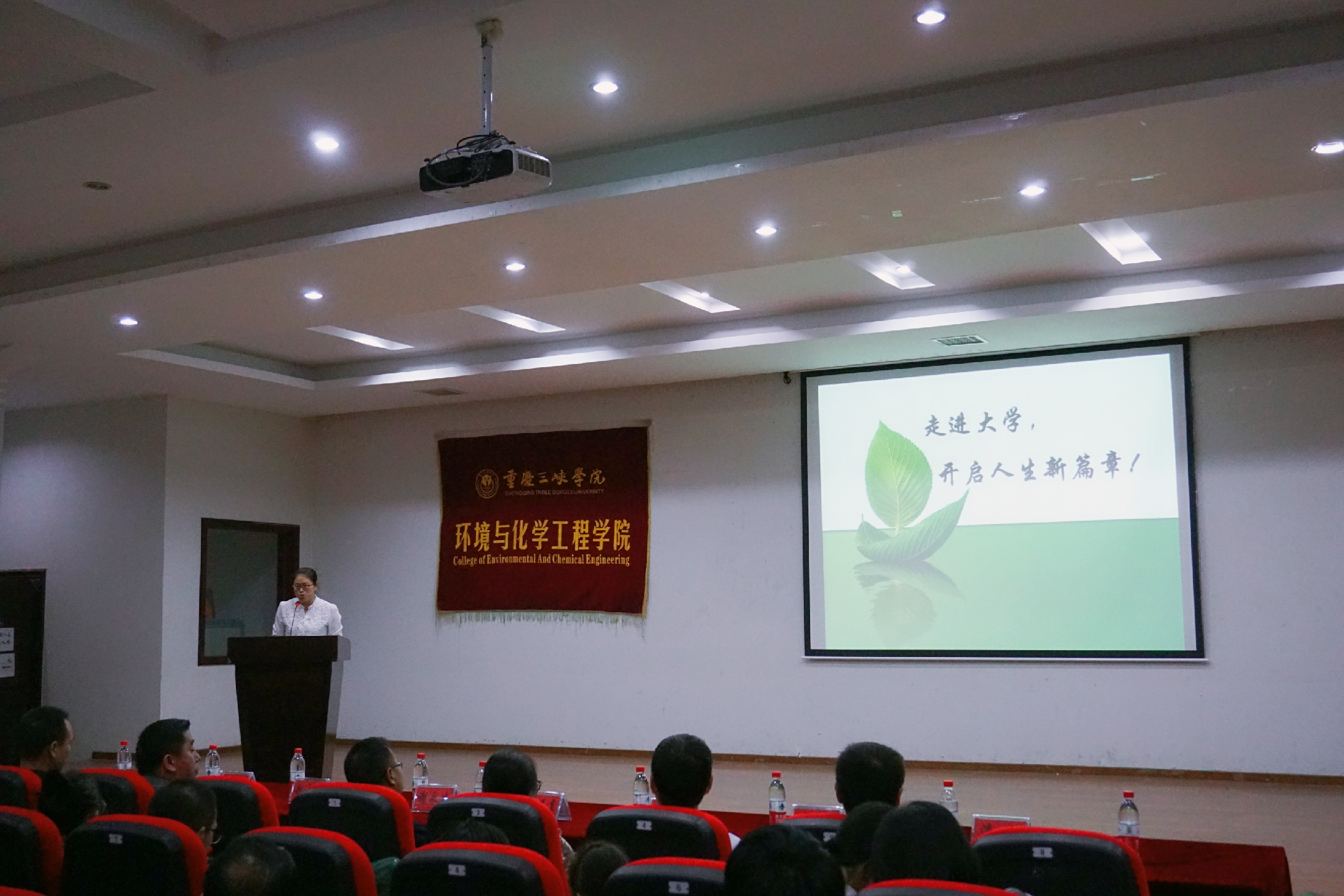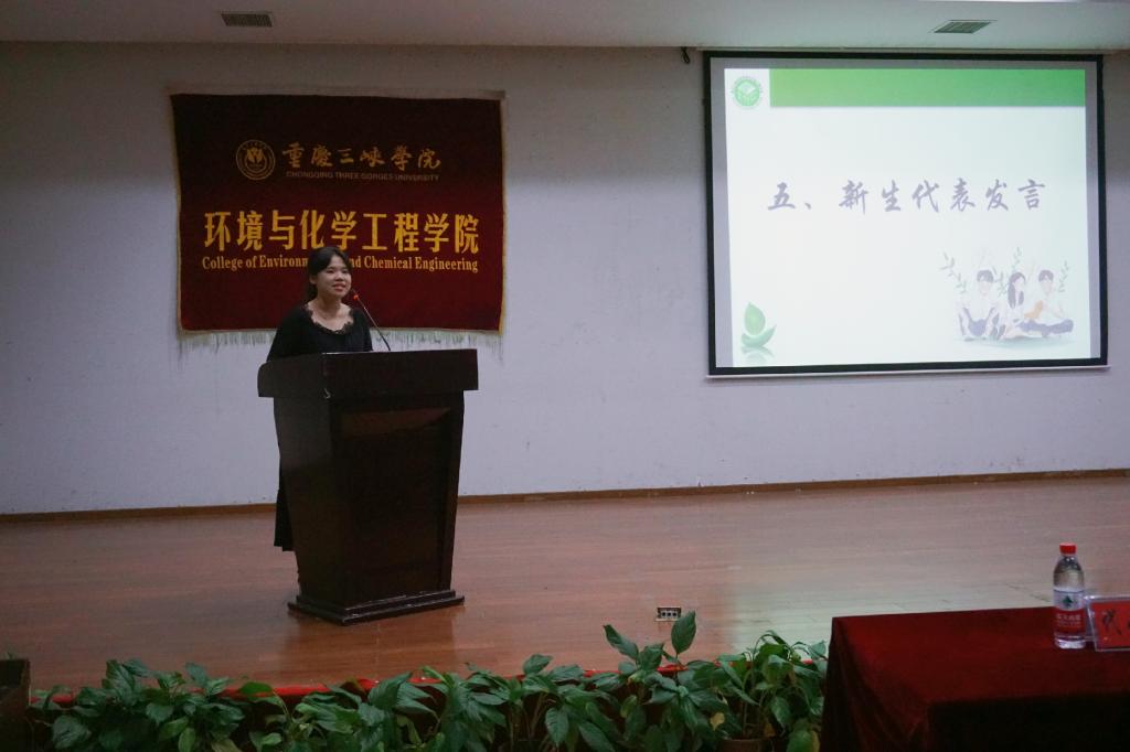 一首国歌拉开了环化学院新生见面会的帷幕。李院长首先致欢迎辞,他对我院286名大一新生的到来表示热烈的欢迎,随即向大家介绍了学院的配套设施,教学、科研资源等,勉励大家珍惜时光,努力学习,追求卓越,要求同学们能在大学四年里不断完善自己,“大学不轻松,大学要从容”,知识成就人才,要做一名优秀的大学生。教师代表郭先华老师告诫新生,不要沉迷游戏。要感恩父母,父母对同学们有养育之恩,老师对同学们有教导之德,并表示期待新生四年之后的辉煌。随后环化学院第一团副刘斯雨代表高年级发言,她以自身走过的路为例,告诉新生要努力学习知识、做人的道理,在这四年里,会有内在的变化,也会有外表的变化。新生代表杜彦莹引用高尔基的一句名言“一个人追求的目标越高,他的才力就发展的越快”,提醒同学们要树立好目标,知识改变命运,态度成就未来。学院党总支副书记代小菊向新同学们提出了殷切期许,希望大家不能辜负老师的循循善诱、学姐的经验之谈,不要浪费学院提供的学习资源,更不要荒废大学四年的宝贵青春。