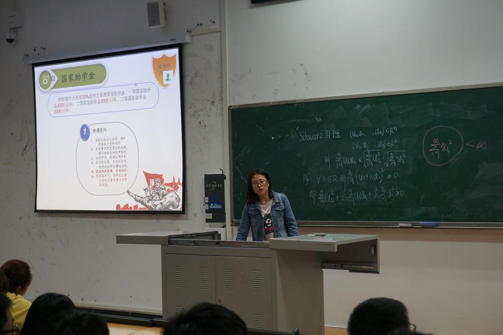 肖老师以学生手册的为基础,着重向大家详细讲解了我校奖励、资助体系,让大家明确各类奖励的基本条件、评定的基本原则,特别是国家奖学金、校长奖学金等重量级奖项,她鼓励新生一定要志存高远,有所作为,一定要努力学习,明确底线,做一个合格大学生。