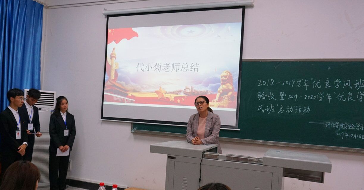 活动开始,六个参与验收的班级的主讲人分别从创建目标、建设措施、成果展示和班级学风建设及文明养成四个方面进行班级展示,各班展示后,评委进行现场提问。活动的最后由代书记进行了活动总结,她指出,优良学风班重点在创建过程,希望所有班级通过创建带动学风,推动良好学风形成。她同时宣布2019-2020学年“优良学风班”创建活动启动。