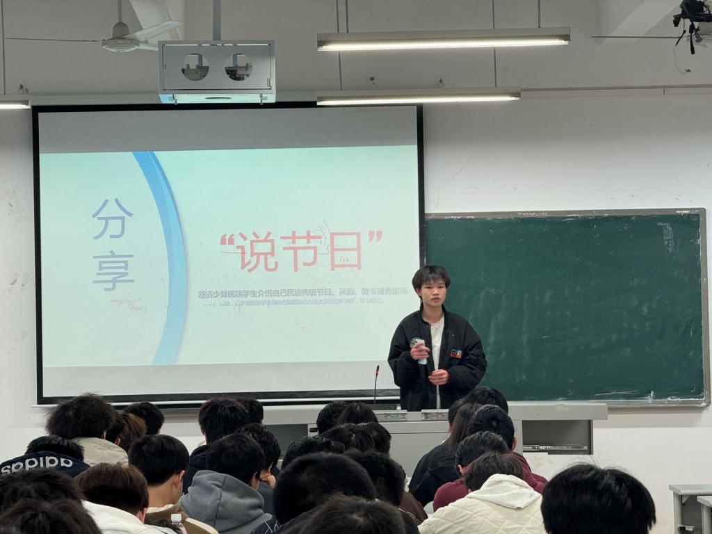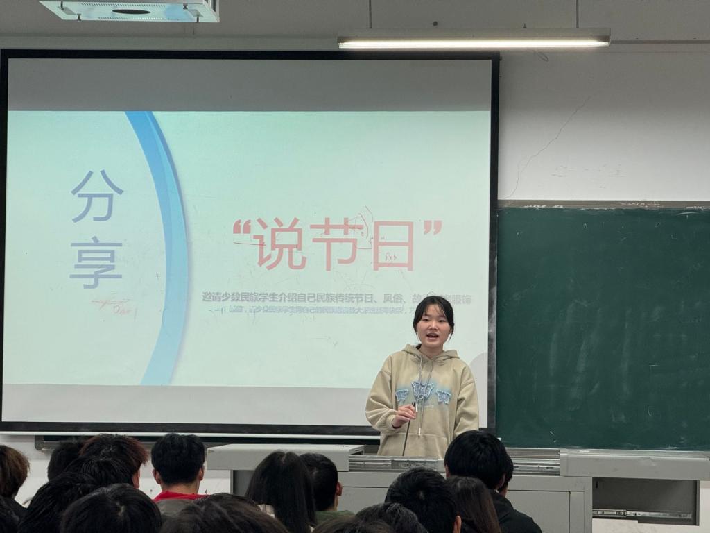 活动现场,回族学生马艺菲、瑶族学生邓朝甲更是热情分享了自己民族的传统节日、风俗习惯、动人故事以及绚丽多彩的民族服饰。他们用真挚的情感和生动的讲述,让在场的每一位同学都能深切感受到中华民族的多元一体文化的独特魅力。