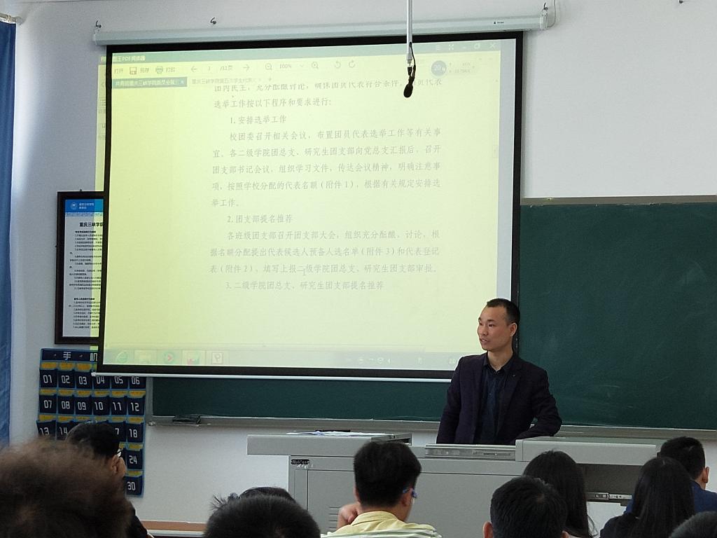 会上,周强老师传达了校团委关于选举团、学代会的会议精神,并结合校团委的文件对学院团学代会代表选举工作进行了详细说明和布置,对代表候选人的基本条件、代表选举程序及具体要求做了深入解读,要求各班级、团支部在充分发扬民主的基础上,在各自班级、团支部做好宣传动员工作,保证代表选举工作严格按程序、按要求进行。周强老师要求与会学生干部深刻领会团学代会的精神,提高认识,以本次团学代会为契机,加强团支部建设,加强班级建设。