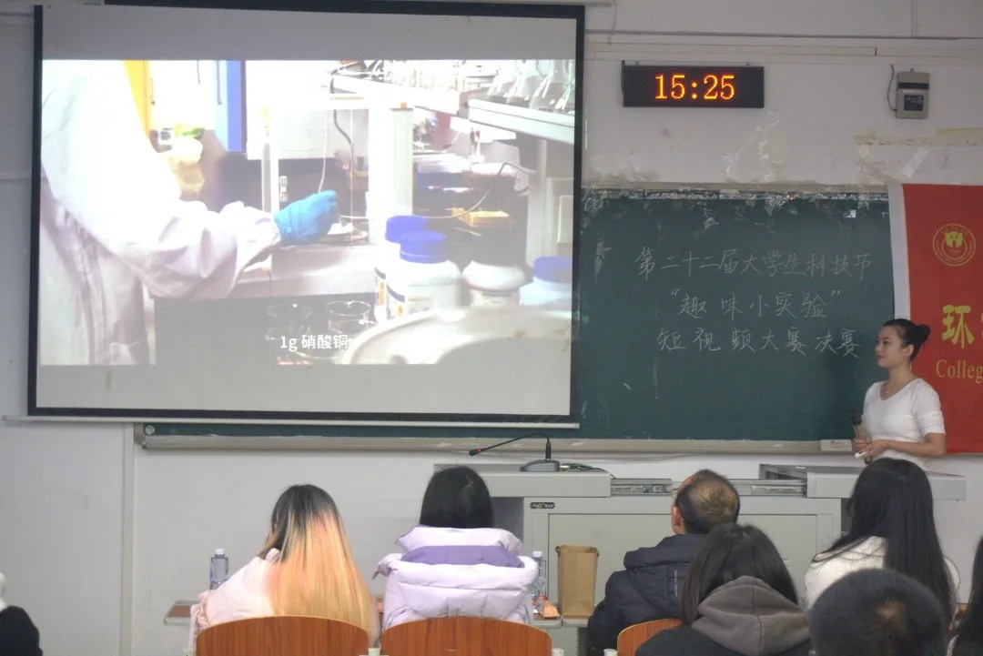 为了激发大学生的创新思维和创造力,增强实践能力,丰富课余生活,将实验与实际现象紧密联系,促进知识学习与实验操作的深度融合,必赢线路检测3003no1媒体融合部于2023年12月3日下午在明辨楼1栋201举办了第二十二届大学生科技节"趣味小实验"短视频大赛决赛。学院高级实验师兼硕士研究生导师张六一、22级环境工程研究生邱子君、23级化教研究生李林林、22级学科语文研究生李明静、团总支副书记(学生)徐竹瑶出席,共计149人参加本次比赛。