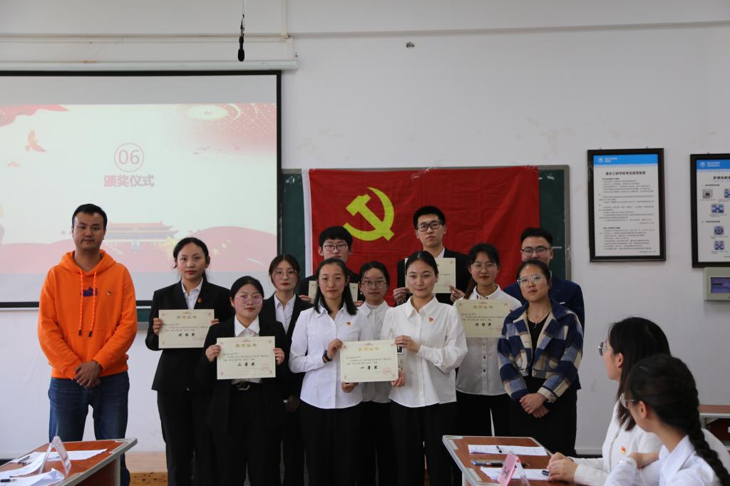 参加本次知识竞答决赛是共计六支队伍,学生一二支部各三支,均是在初赛环节中获得前三名的队伍。本次决赛分为党史知识闭卷考试、小组个人轮流答题、小组赛三个环节。相较于初赛,决赛环节还设置了观众答题以及合唱爱国歌曲环节。在闭卷考试环节,参赛选手们心无旁骛,认真在答卷上作答,均取得了满分的成绩。在小组个人轮流答题上,大家你追我赶,互不相让,成绩不分伯仲。在小组赛上,各小组团结一致,紧密配合,在激烈的比赛中,“一往无前队”和“一路同行队”打成平手。为决出胜负,学生第二党支部书记现场出题决出本次竞赛的冠军,最终“一往无前队”荣获第一名,“一路同行队”荣获第二名,获得优胜奖的队伍分别是“不忘初心队”、“自强创新队”、“砥砺前行队”和“艰苦奋斗队”。