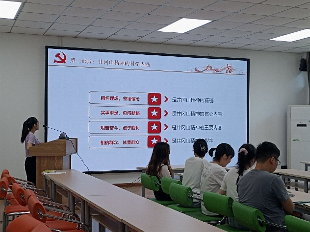 2022年6月30日下午4:30,环化学院学生第三党支部在慎思楼四栋206开展 “不忘井冈山精神继续前行”党课,支部宣传委员夏利林同志主讲,支部成员共计24人参加此次会议。
