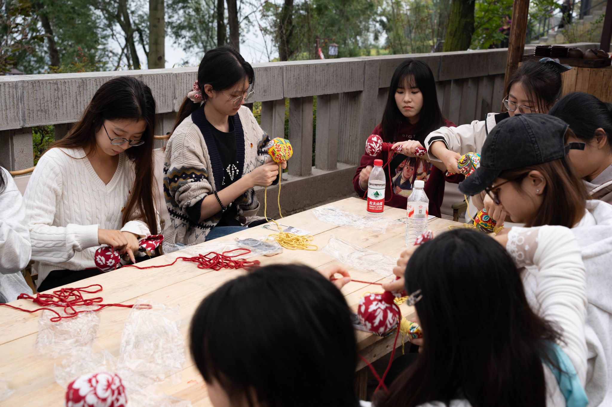 沿着青石古道拾级而上,党员们在层林尽染中探访山城防御体系遗址。登临制高点后,同志们依次擂响象征历史传承的行军鼓,浑厚鼓声在山谷间回荡。学生党员黄阳阳激动地表示:“每一声鼓响都让我感受到与历史的深度对话,这不仅是力量的传递,更是精神血脉的赓续。”在天生城文物陈列馆,珍贵文物与沉浸式沙盘生动展现了这座长江上游军事要塞的营造智慧。预备党员邵文杰在参观后深有感触:“这些文物让我们直观理解了古人的智慧,作为环境科学专业学子,更要从中汲取生态营城的传统智慧。”非遗工坊内,党员们亲手制作艾草养生锤,在一针一线中体悟工匠精神。学生党员陈思蒙分享道:“亲手制作的过程让我体会到传统文化的魅力。”