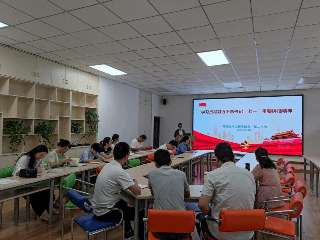 2021年9月16日下午,环化学院教工第二党支部在慎思楼4-206会议室开展9月主题党日,集中学习习近平总书记“七一”重要讲话精神,会议由党支部书记宋先雨主持,支部20名党员参加。