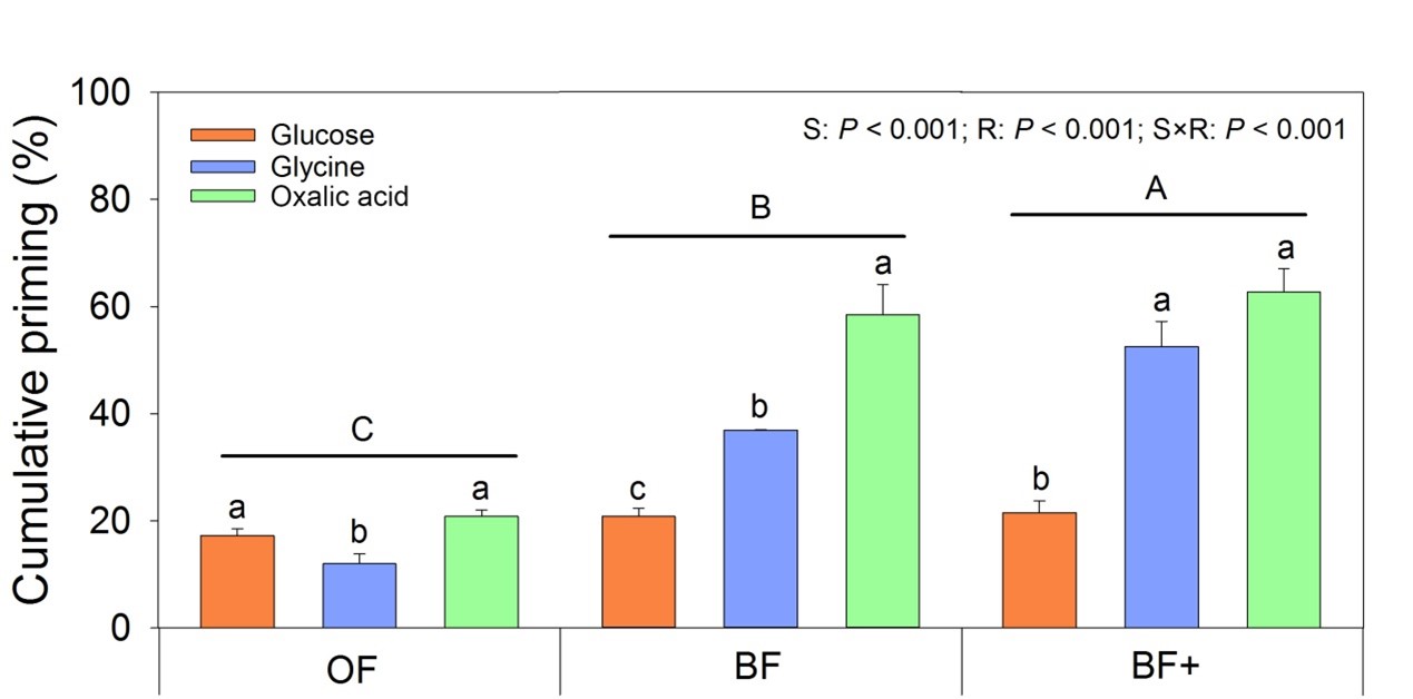 图3 撂荒(OF)、裸地(BF)和裸地+培养(BF+)土壤在葡萄糖、甘氨酸和草酸处理下的土壤累积激发效应。不同小写字母表示每种土壤的不同处理之间存在显著性差异,不同大写字母表示每种土壤之间存在显著性差异(P<0.05)。