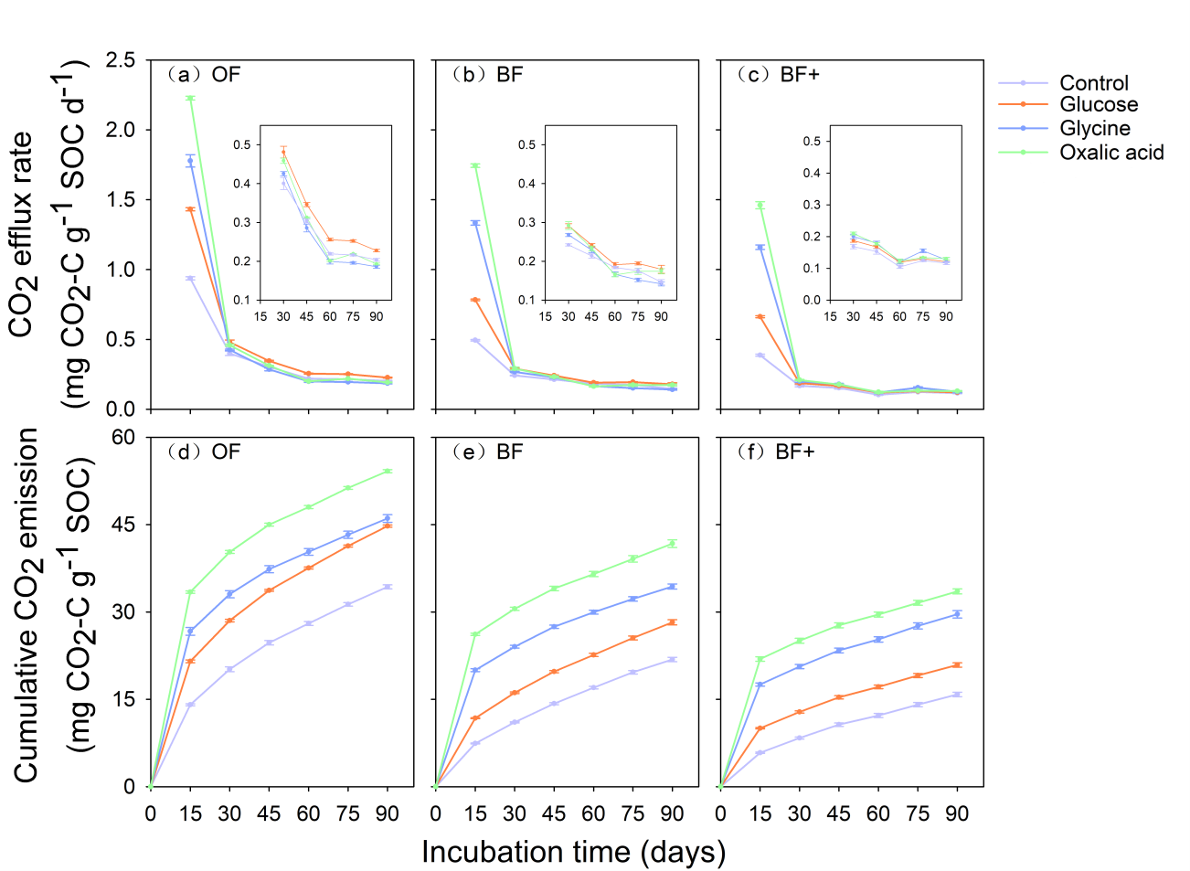 图2 撂荒(OF)、裸地(BF)和裸地+培养(BF+)土壤在对照、葡萄糖、甘氨酸和草酸处理下90 d内CO2释放速率(a、b和c)和累积CO2释放量(d、e和f)。小图表示从第15天开始的CO2释放速率。