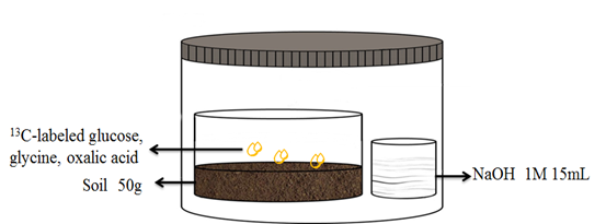 我们在90天的培养实验中比较了在三种根系分泌物输入下三种土壤类型的激发效应。本研究以不同周转速率土壤碳库为研究对象,通过对连续15年保持植物碳输入的撂荒地土壤(OF)和连续15年人工管护,剔除地上植被、保持无碳输入的裸地土壤(BF),以及经过23年的长期裸地处理和额外815天的室内培养后的裸地+培养土壤(BF+)进行实验,添加根系分泌物(13C脉冲标记的葡萄糖、甘氨酸和草酸),并利用静态碱液吸收法对土壤呼吸CO2进行全程捕获(图1),测定土壤呼吸速率及其δ13C值变化,利用13C同位素示踪法对土壤和根系分泌物来源CO2进行区分,利用裸地、撂荒试验处理区分不同活性土壤有机碳,探讨不同活性土壤有机碳分解的激发效应。