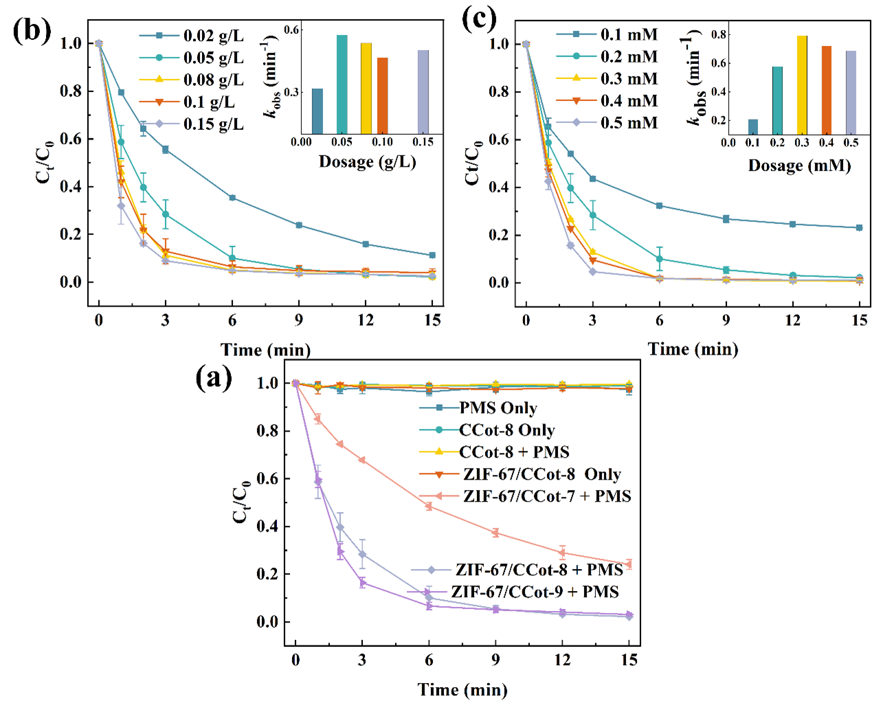 图2 (a)不同材料的降解性能,(b)催化剂用量的影响,(c)PMS用量的影响。