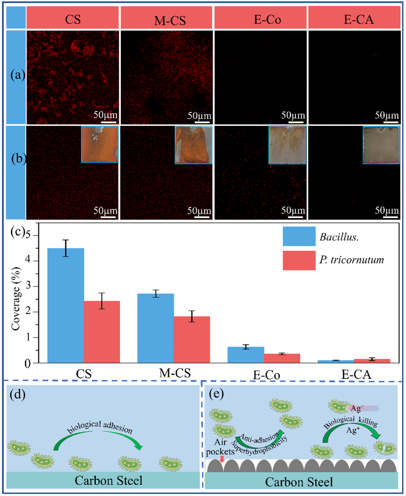 在防污性能方面,针对芽孢杆菌和三角褐指藻的测试显示,E-CA涂层表现出出色的防微生物污损能力。芽孢杆菌在E-CA涂层上的覆盖百分比仅为0.092%,三角褐指藻的覆盖百分比为0.10%,远低于其他对比涂层。这得益于涂层粗糙结构中形成的“空气”减少了微生物与涂层的接触,同时Ag纳米颗粒释放的离子有效抑制了微生物生长。