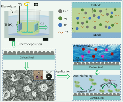在海洋环境中,金属材料的腐蚀与生物污损问题严重制约着海洋经济发展。受荷叶自清洁现象的启发,超疏水涂层在防腐和防污领域得到了广泛研究。本研究采用一步电沉积技术,通过调控电沉积参数来控制表面的微纳米结构,在碳钢片上成功制备出具有菜花状粗糙结构的超疏水Co/Ag复合涂层。优化的涂层E-CA表面展示出优异的润湿性能,其接触角(CA)高达163.8°,滑动角(SA)低至3.5°,这一特点能够有效抑制微生物的附着。该涂层在防/去冰、耐酸碱和耐磨损等方面具有显著效果,特别的,该涂层在防腐蚀和防污性能方面表现卓越。