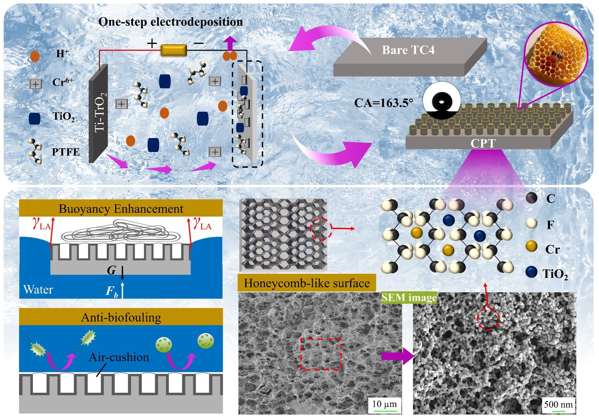 Ti-6Al-4V(TC4)钛合金因其高强度和耐腐蚀性而在海洋设备制造领域得到广泛应用。然而,当TC4长时间浸泡在海洋环境时,表面容易附着微生物。微生物的附着和积累导致设备表面结垢从而导致航行阻力增加、管道堵塞甚至设备故障或失灵等问题。本课题采用一步电沉积法在TC4表面制备了具有蜂窝状粗糙结构的Cr/PTFE/TiO2(CPT)超疏水镀层,可有效提高TC4的抗生物污损能力。