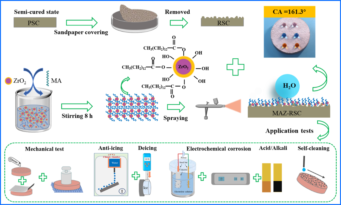 混凝土因其出色的机械性能而被广泛应用于道路铺设、隧道工程、桥梁建设等领域。然而,混凝土的多孔性和亲水性会导致水滞留在孔隙中。此时,若遭受低温等恶劣环境,混凝土中的水将会结成冰,从而降低路面的摩擦力,导致车轮打滑,引发交通事故。同时,在孔隙中形成的冰将产生更大的内应力,增加混凝土开裂的可能性。另外,如果混凝土中吸附了含有腐蚀性离子(如防冻盐中的Cl–离子)的水,混凝土内部的钢筋可能会受到腐蚀,损害混凝土的使用性。本课题组使用砂纸覆盖和喷涂两步法在混凝土表面制备出坚固的超疏水myristic acid/ZrO2(MAZ-RSC)表面,可有效提高混凝土的防污自洁、防冰与耐腐蚀能力。
