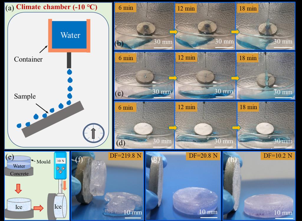 图3不用样品的防冰和除冰能力测试。(a)防冰测试示意图;(b) PSC、(c) MA-RSC和(d) MAZ-RSC的防冰过程。(e)除冰测试示意图;(f) PSC、(g) MA-RSC和(h) MAZ-RSC除冰测试后的宏观图片。