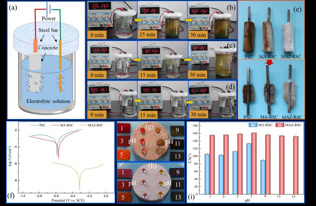 图4 (a)电化学腐蚀试验示意图。26 V电压下30 min内,(b) PSC、(c) MA-RSC和(d) MAZ-RSC在3.5 wt.% NaCl溶液中的腐蚀过程。(e)电化学腐蚀后钢筋的形貌。(f)在3.5 wt.%的NaCl溶液中,不同混凝土样品的Tafel曲线。溶液pH对(g) MA-RSC和(h) MAZ-RSC疏水性的影响。(i)为(g)和(h)的相应的接触角值