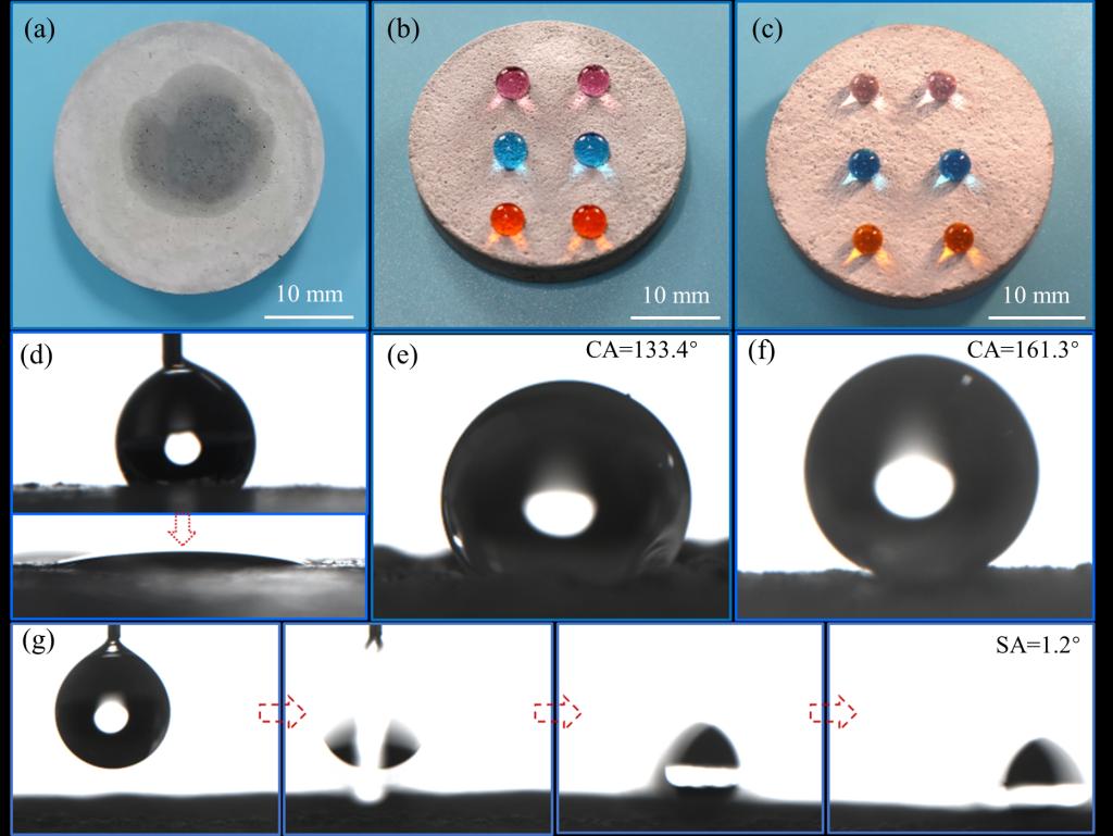 MAZ-RSC表面上液滴呈现为球形,CA值为161.3°。液滴能以约1.2°的斜率(SA = 1.2°)迅速从MAZ-RSC上滚落,表现出极低的附着力。这种现象可归因于MAZ-RSC的微/纳米结构能够在液滴和固体表面之间形成稳定的“气垫”,它能促进“液-固”界面转化为“液-气-固”界面,防止水滴润湿混凝土表面,使MAZ-RSC实现了超疏水性。