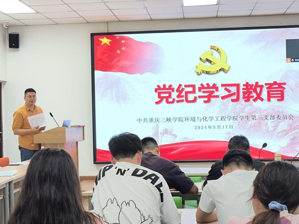 为深入学习贯彻习近平新时代中国特色社会主义思想,进一步深化党员对修订后的《中国共产党纪律处分条例》的理解和认识,提升党员的纪律意识和规矩意识,做到学纪、知纪、明纪、守纪,学院党总支学生第三党支部于5月17日开展“坚持严的主基调不动摇 扎实开展党纪学习教育”主题党日活动。活动由党支部书记尹华伟同志主持。